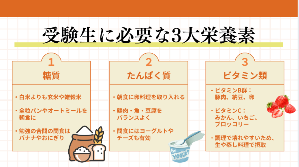 本記事では、受験期に欠かせない栄養素「糖質・タンパク質・ビタミン類」に注目し、集中力を高める食事の摂り方を解説します。
