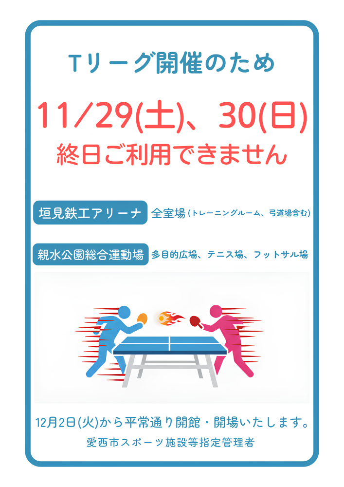 日頃から愛西市スポーツ施設をご利用いただき、ありがとうございます。