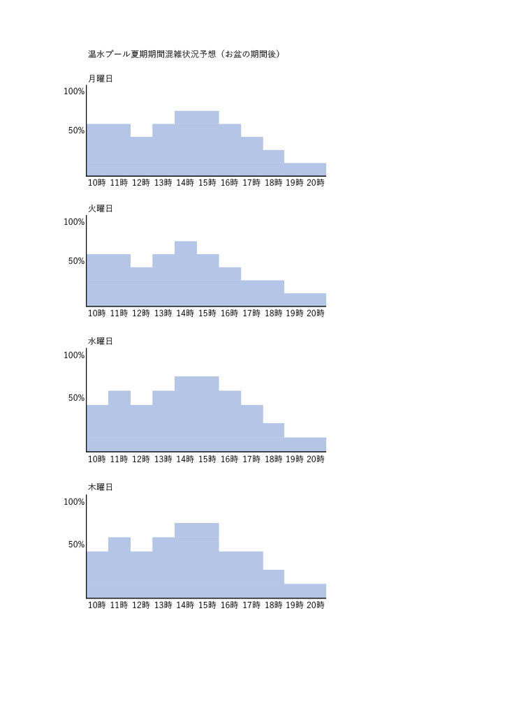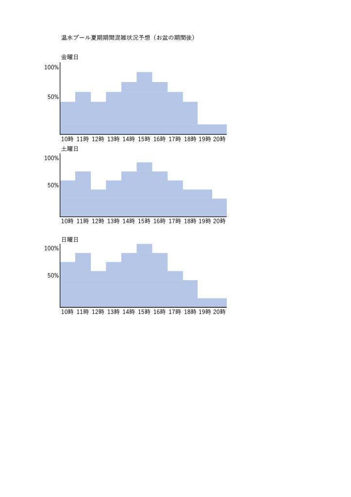 お盆以降の温水プールの時間混雑予想です。プールご利用の参考にご活用いただければと思います。
