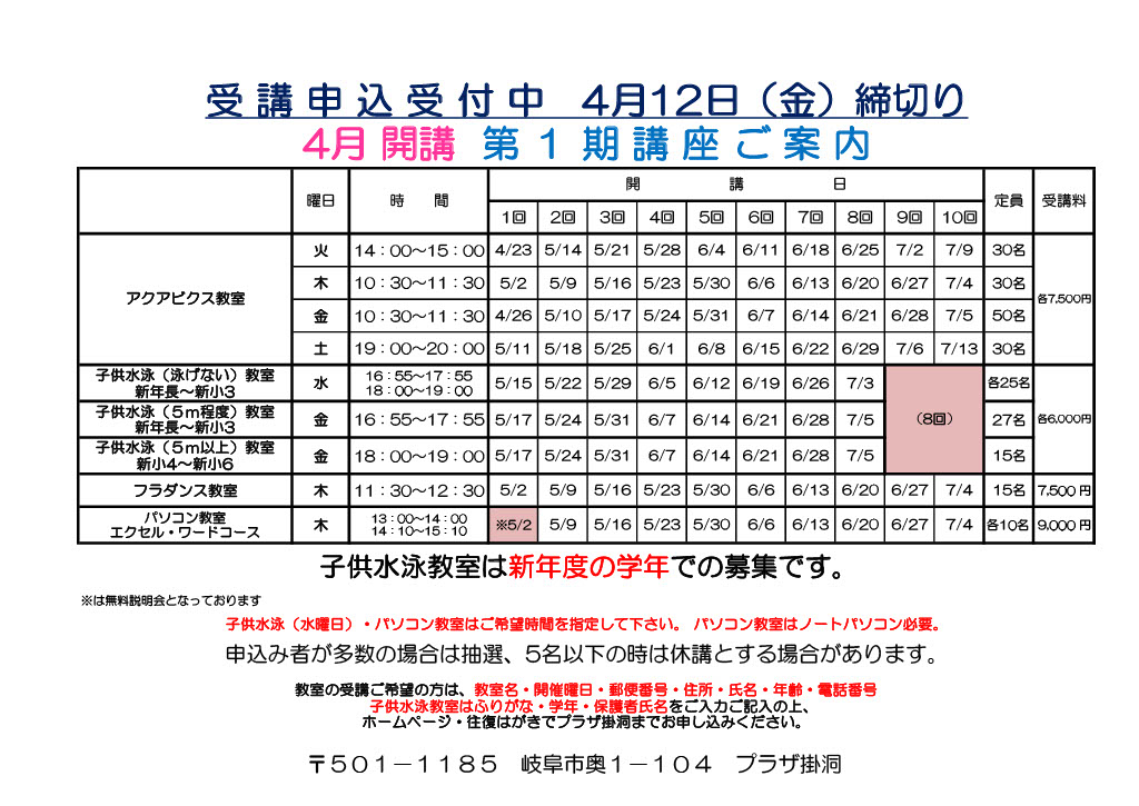 令和6年度 第1期各種教室の申し込みを受付けております。