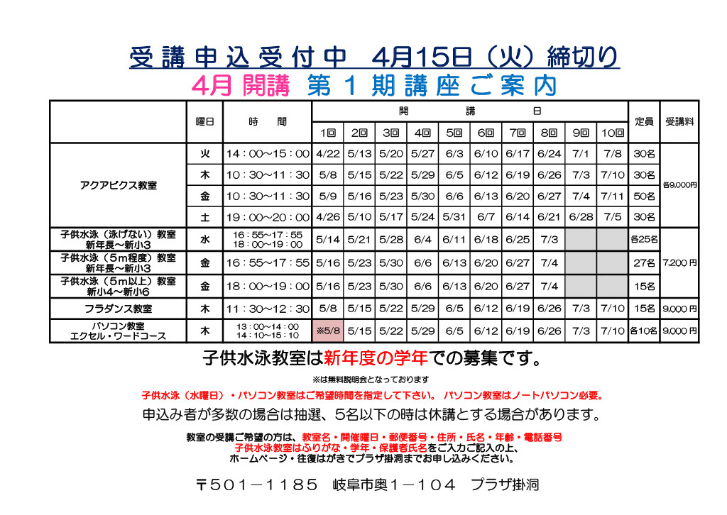 令和7年度 第1期各種教室の申し込みを受け付けております。