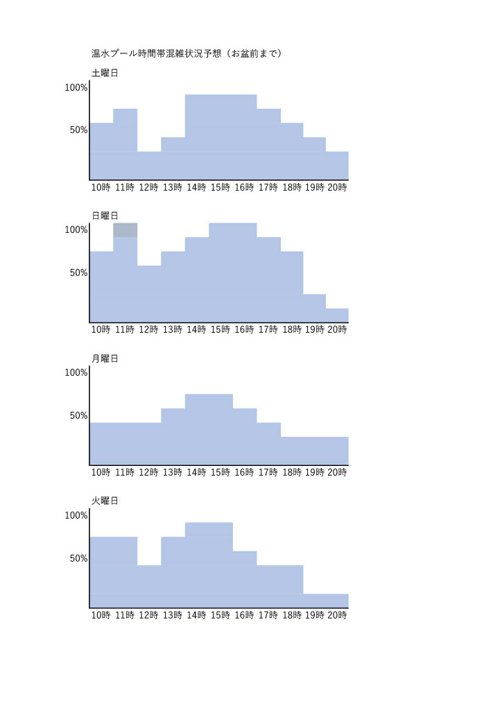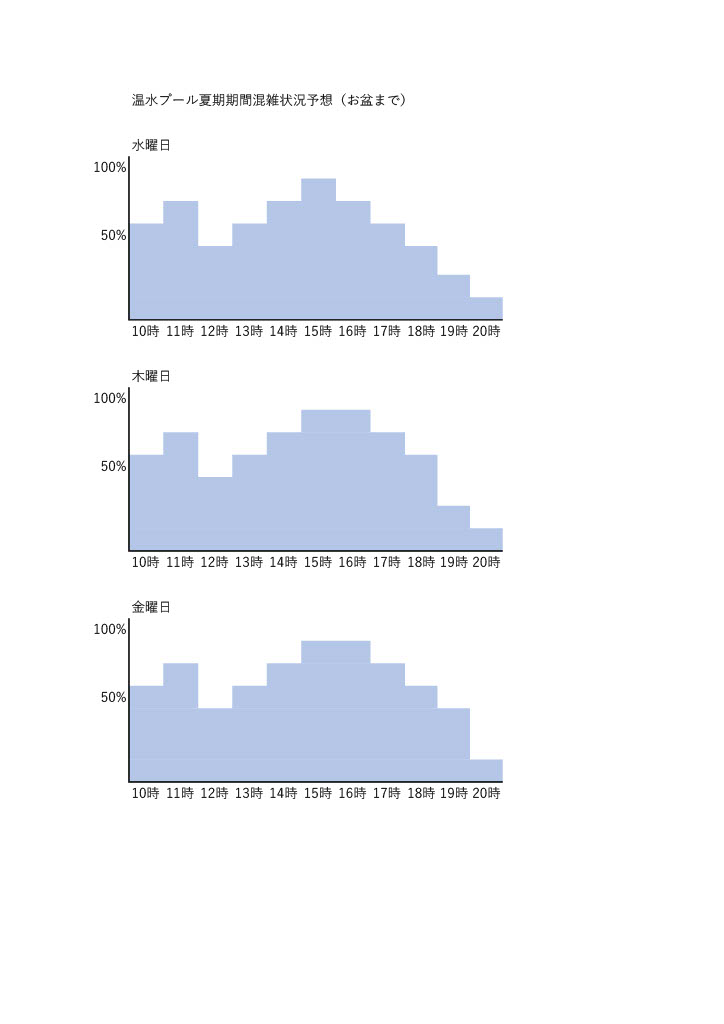 2024.07.28 お知らせ 夏期学校休業期間の時間混雑予想(盆まで) 土日には待ち時間が発生することがあります。 更衣室のロッカーキーが出払うと、帰ってくるまでお待ちいただくことがあります。 混雑状況を更新しました 一覧に戻る