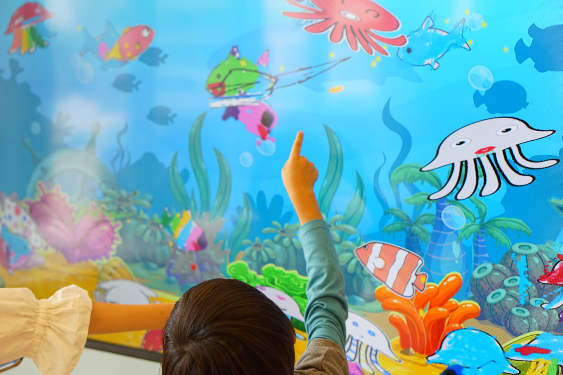 自分で紙に描いた絵がモニターの中で動き回ります。🐡