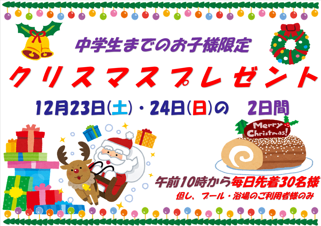 2023.12.23 お知らせ 【クリスマスイベントについて】 【メリークリスマス】 12月23日(土)・24日(日)の2日間 中学生までのお子様限定 午前10時から毎日先着30名様に景品をプレゼントいたします。 但し、プール・浴場のご利用者様のみ みなさま、プラザ掛洞へ是非お越しください。 一覧に戻る