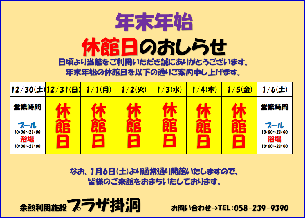 2023.12.23 お知らせ 【年末年始のご案内】 年末年始の休館日のお知らせです。 12月31日~1月5日まで休館日となります。 新年は1月6日(土)より通常通り営業いたします。 ご不便をおかけしますが何卒宜しくお願いします。 一覧に戻る