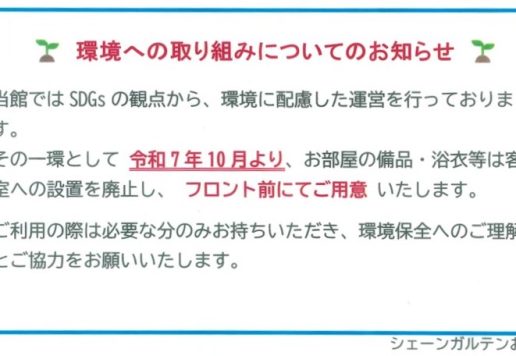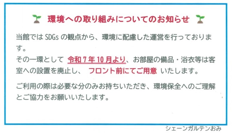 <宿泊のお客様へのご案内> 令和7年10月1日より、アメニティはフロント前にてご用意させていただきます。 必要な分のみお持ちいただき、プラスチック製品削減にご協力をお願い致します。