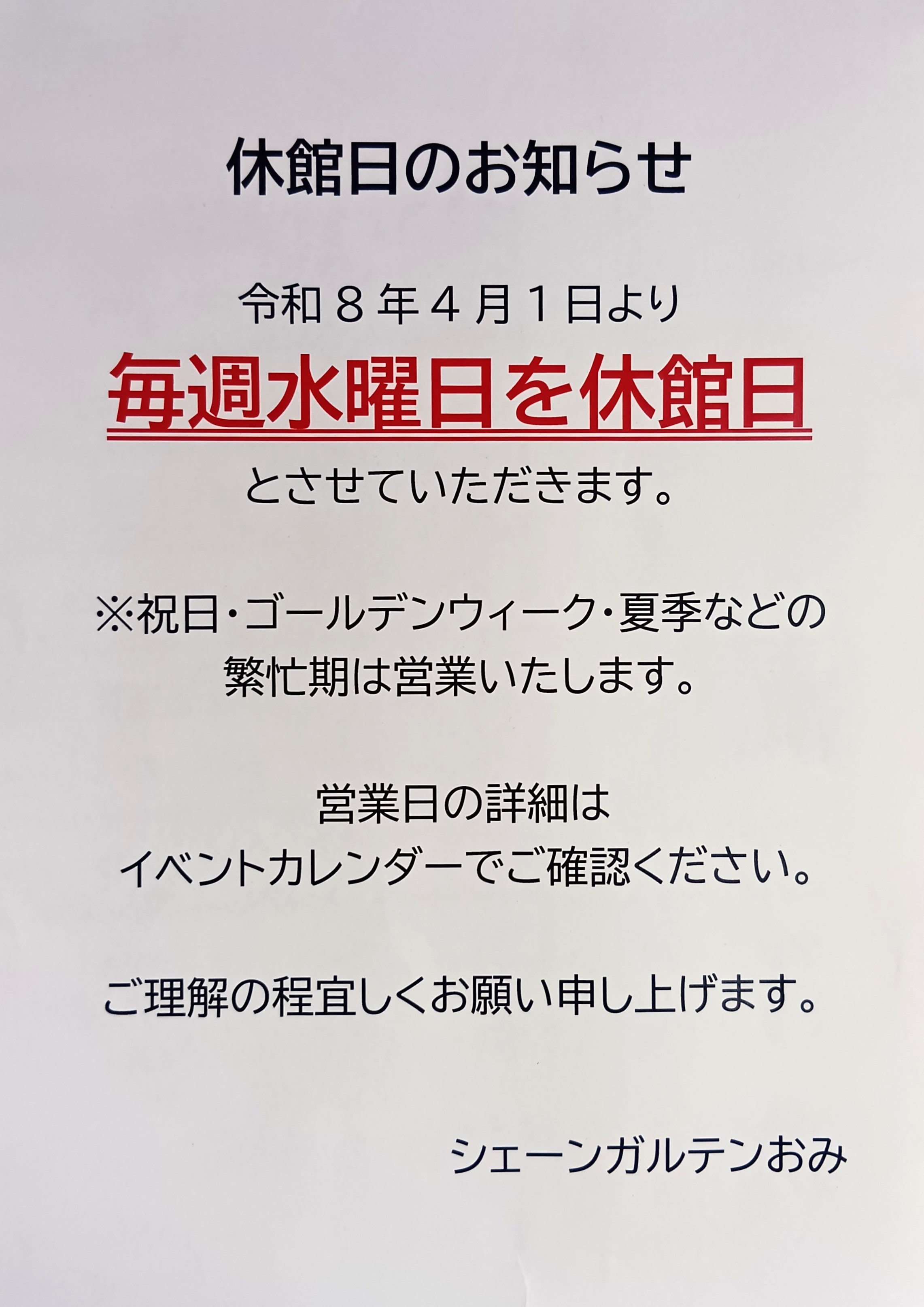 令和8年年4月1日より、毎週水曜日を休館日とさせていただきます。
