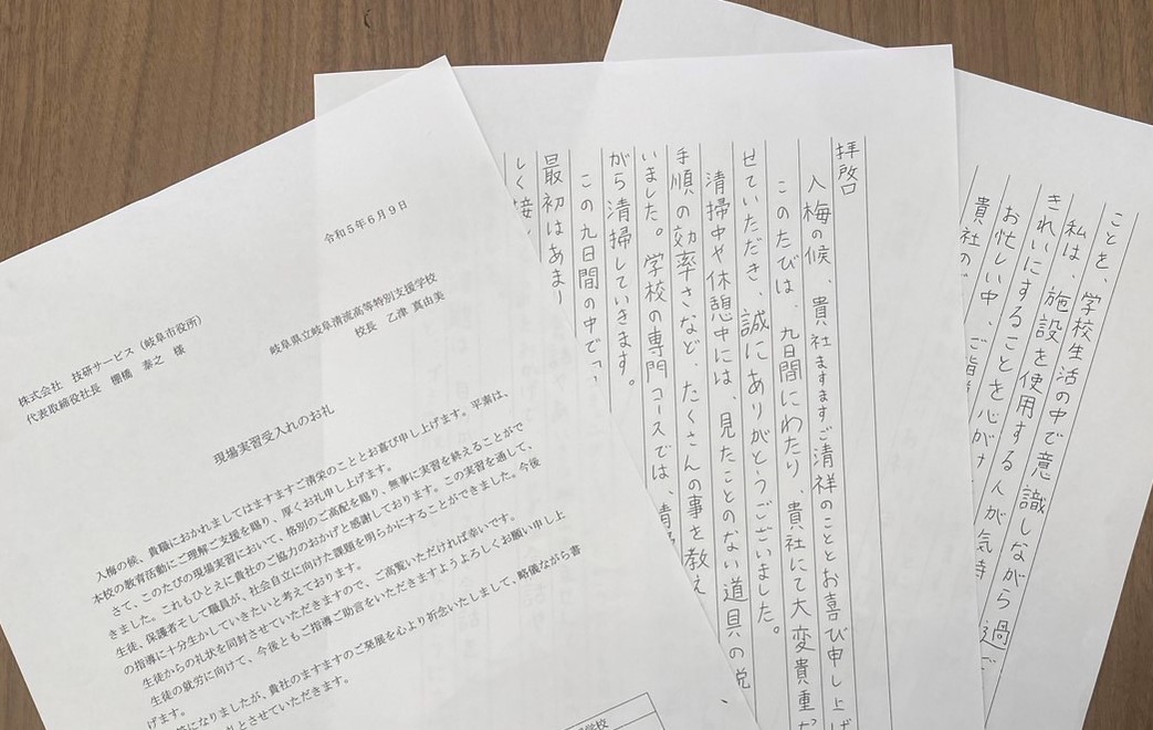 2023.06.19 ビルメンテナンス 実習生からお礼のお手紙いただきました! こんにちは!技研サービスのBM事業部です。 先日、現場実習を終えた学生さんからお礼のお手紙をいただきました! 今回は9日間の清掃の実習を行いました。 道具の説明や効率が上がる清掃手順の方法など、実習生にとって学びになることを教えることができ幸いです。 今後もより多くの生徒さんを実習生として受け入れ、社会で活躍できる人材育成に努めていきます!
