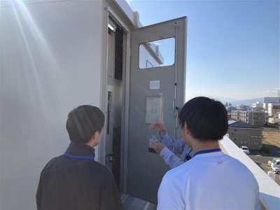 屋上など実際の設備現場を見学し、配線や機械などの構造を学んでいただきました。