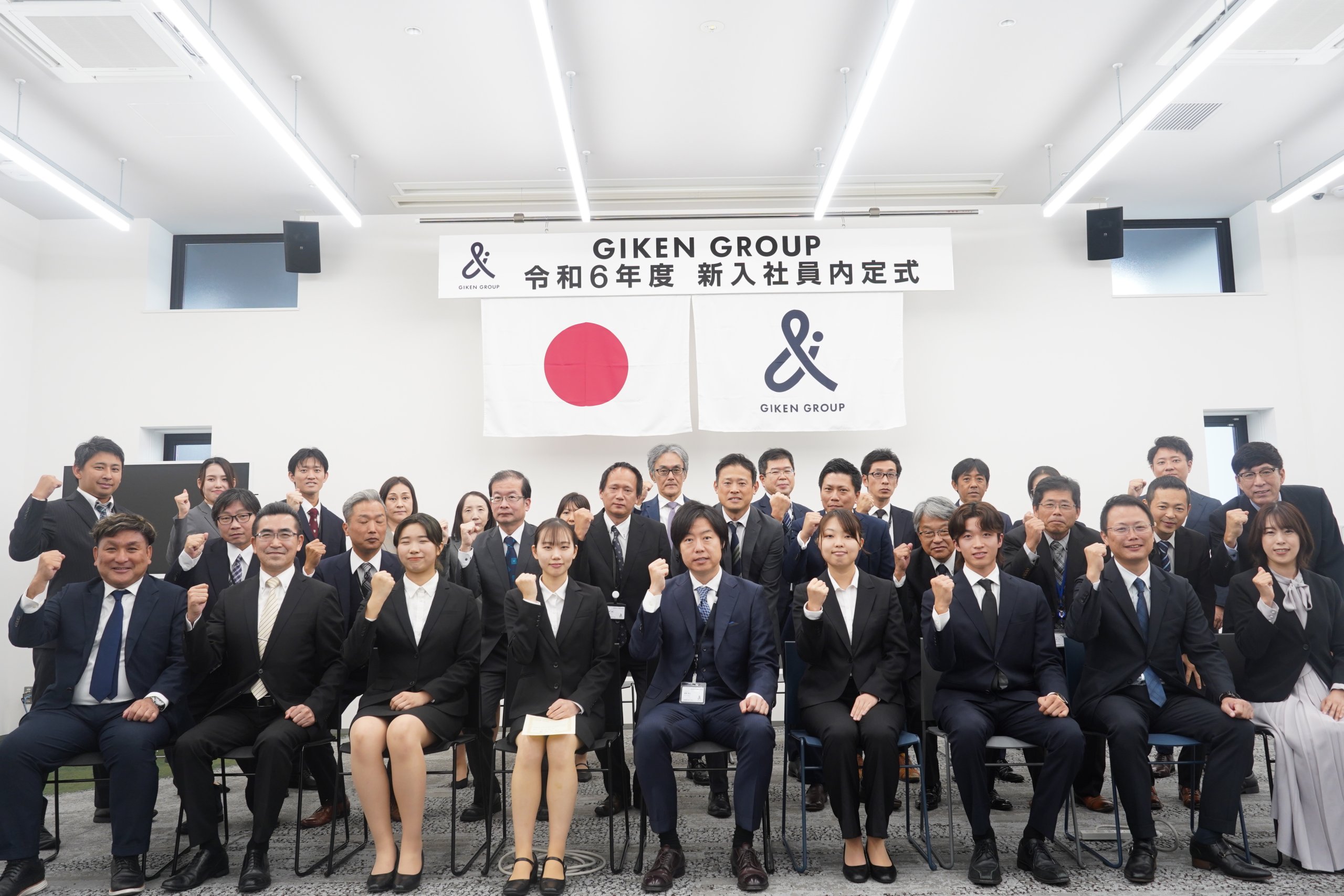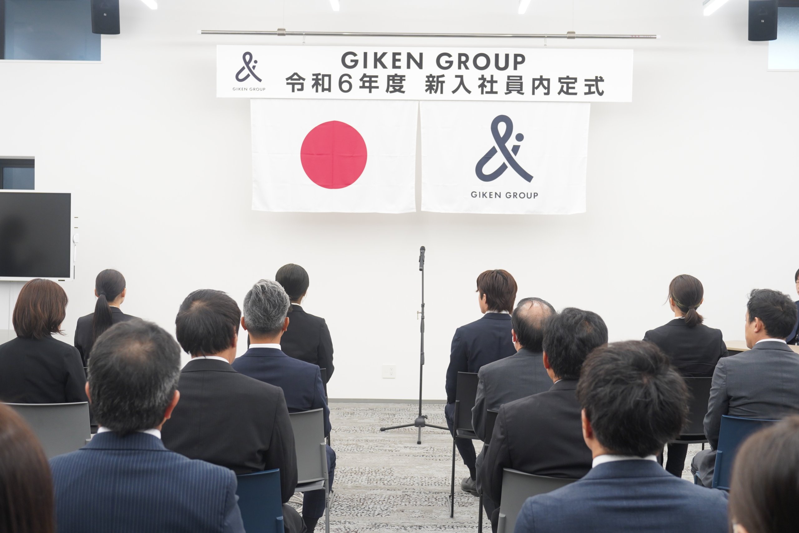 2023.10.05 新卒採用 令和6年度新入社員内定式を行いました こんにちは!技研サービスです。 10月5日(木)、GIKEN GROUPの令和6年度新入社員内定式を執り行いました。 今年度は4名の内定者が参加し、GIKEN GROUP社員が迎え入れました。 内定式では棚橋社長挨拶、証書授与から始まり、内定者がそれぞれ決意表明を行いました。 内定者全員が将来のビジョンをしっかり見据え、堂々と目標を宣言している姿が印象的でした。 また、部署長から各部署の展望と激励の言葉を頂きました。 内定者はそれぞれの事業内容と自身のやりたいことをイメージさせながら話を聞いていました。 懇親会では更にリラックスした状態で役員・部署長たちと交流を深めました。 当社を選んでくれた4名が入社後どんな活躍をしてくれるのか、今からとても楽しみです!
